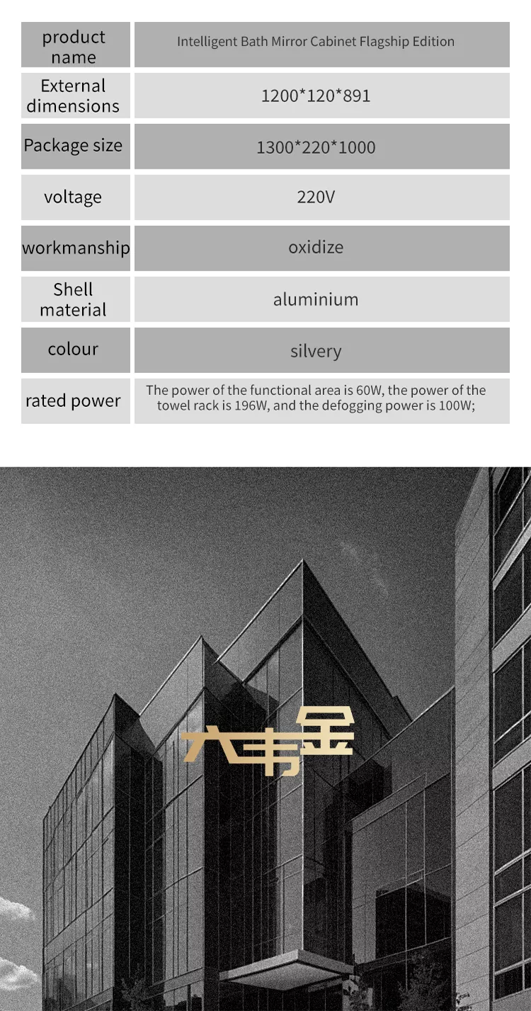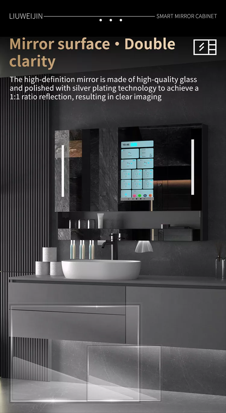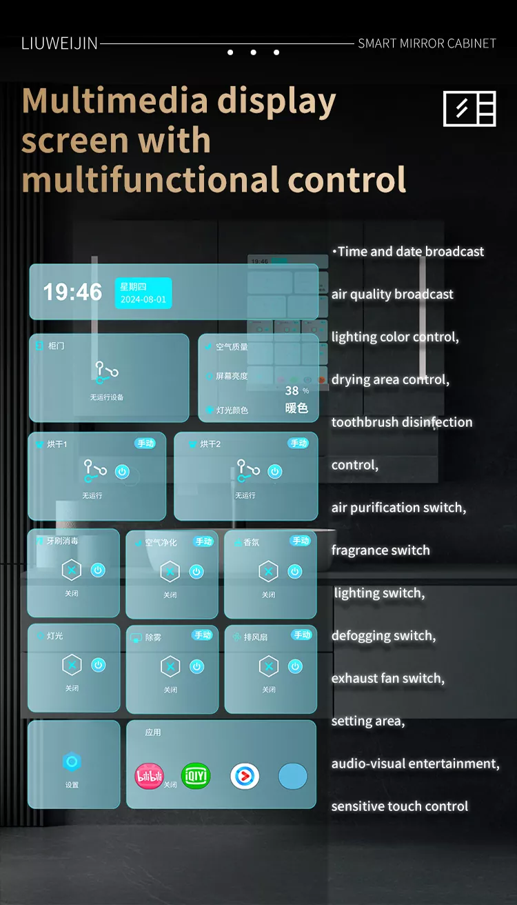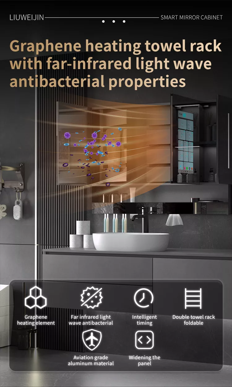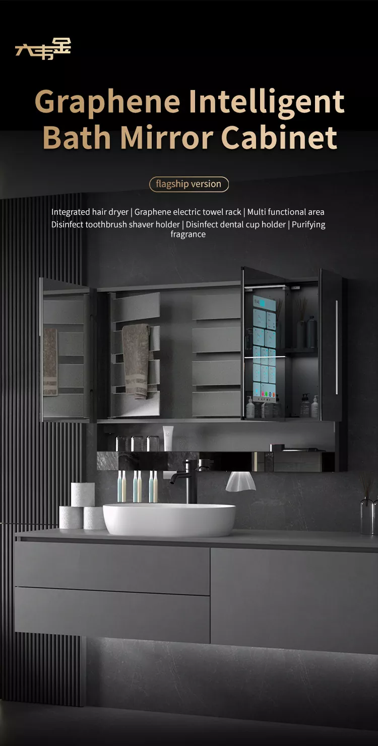 Бұл Liuwei jinshi jinshi jinshi-дің айна шкафы, ылғалдандыратын және ылғалдандыратын зат, тіс шкафын драйвер, тіс тостаған ультрадыбыс құрылғысы, ұстараны дезинфекциялау құрылғысы, тісті дезинфекциялау құрылғысы, шаш кептіргішке арналған қос мақсатты түрлендіру құрылғысы, айна Экран, индукциялық қолды тазартқыш, айна диогольсіз жүйесі, чен түрін басқару орталығы. Сәнді модель графенмен жылыту және кептіру сүлгімен жабдықталған, зияткерлік хош иіс жүйесі және ауаны тазарту жүйесі. Сонымен қатар, үлкен экранда аудио және видео ойын-сауық, ауа-райы мен бейнені, бағдарламаны және т.б.
