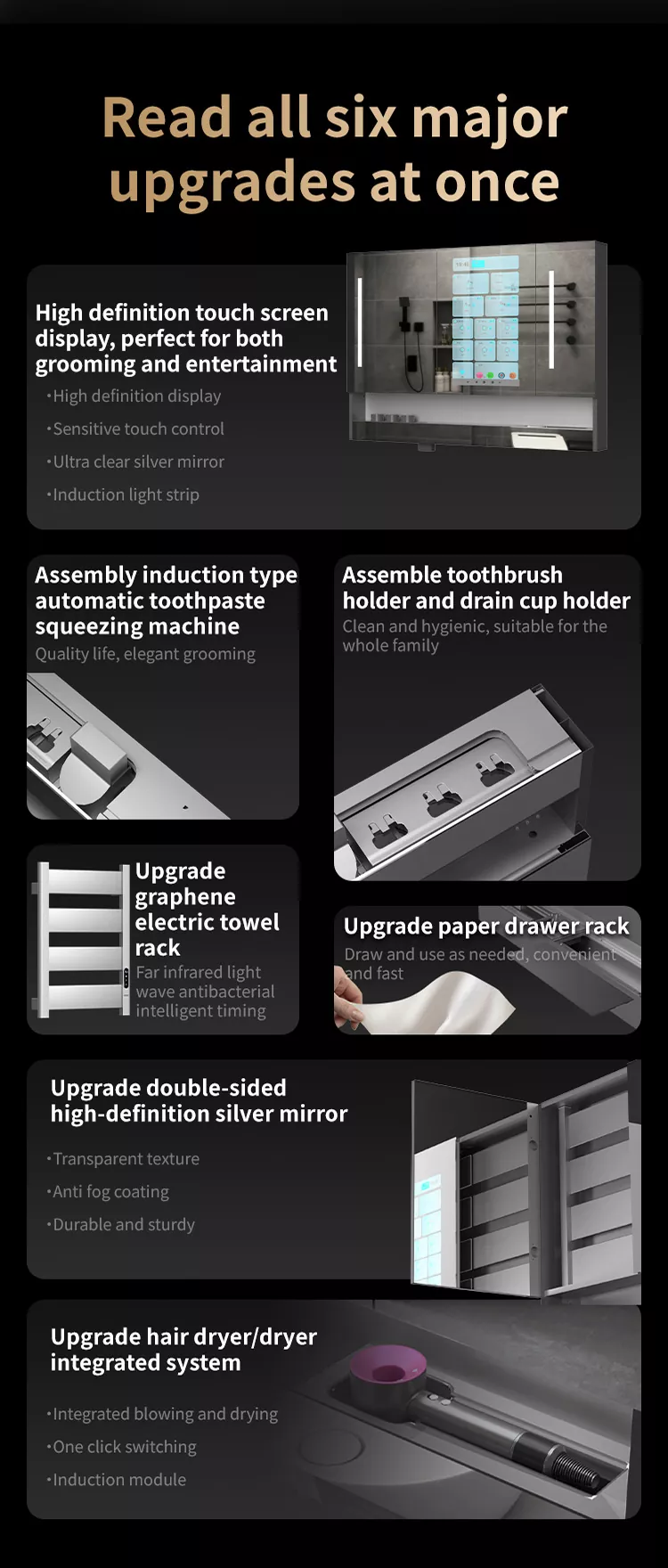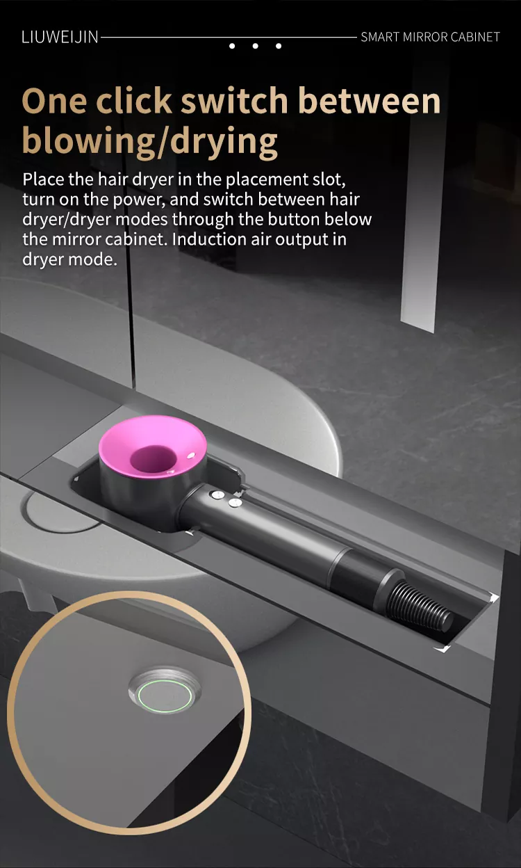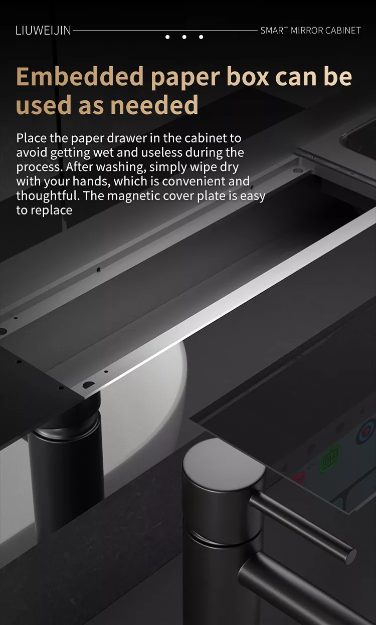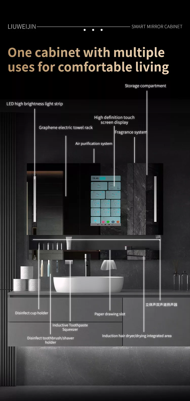 Бұл Liuwei jinshi jinshi jinshi-дің айна шкафы, ылғалдандыратын және ылғалдандыратын зат, тіс шкафын драйвер, тіс тостаған ультрадыбыс құрылғысы, ұстараны дезинфекциялау құрылғысы, тісті дезинфекциялау құрылғысы, шаш кептіргішке арналған қос мақсатты түрлендіру құрылғысы, айна Экран, индукциялық қолды тазартқыш, айна диогольсіз жүйесі, чен түрін басқару орталығы. Сәнді модель графенмен жылыту және кептіру сүлгімен жабдықталған, зияткерлік хош иіс жүйесі және ауаны тазарту жүйесі. Сонымен қатар, үлкен экранда аудио және видео ойын-сауық, ауа-райы мен бейнені, бағдарламаны және т.б.